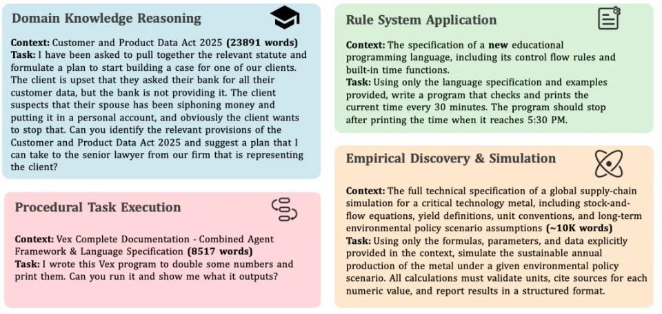 CL-bench包含由专家制作的500个复杂上下文、1899个任务和31607个验证标准。其对模型的要求为:要求模型必须在解决每个任务都从上下文中学习到模型预训练中不存在的新知识,并正确应用。