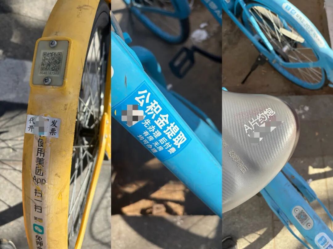 但毋庸置疑的是,经历了商海沉浮的共享单车,早已成功把自己变成了城市的有机组成部分。其最明显的证据,就是牛皮癣广告们对它们的“认可”。据北京市交通委数据,2025年全市累计清理共享单车上的非法广告1267万张。刺猬公社(ID:ciweigongshe)也随机抽查了附近的几十辆共享单车,上面的非法广告内容以黄色与色情服务网站居多,另外一些则是关于公积金提取、代开发票等业务。