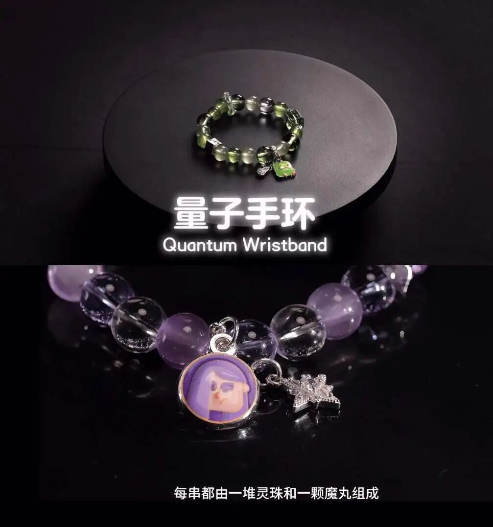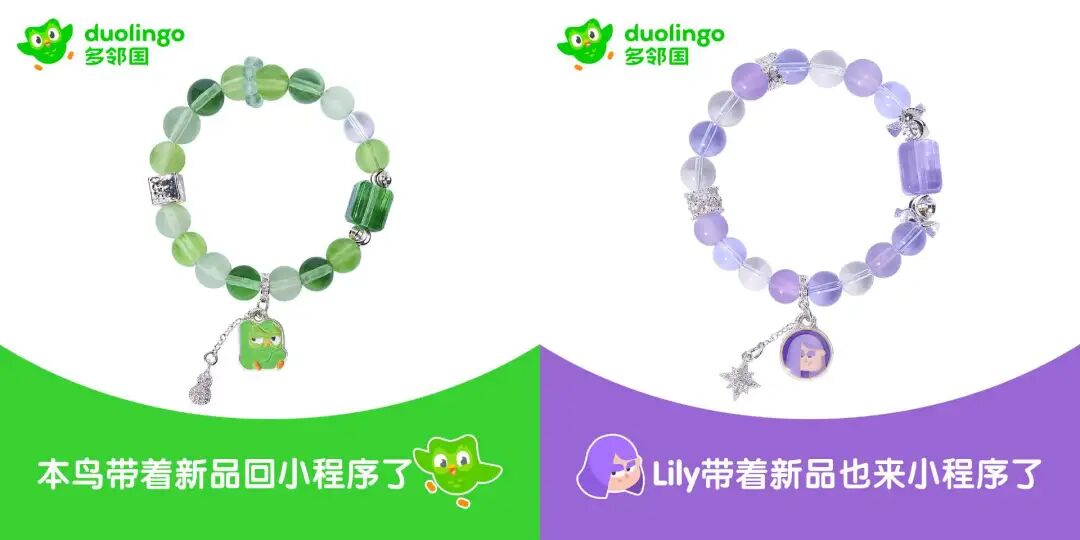 多儿为绿色款、拽姐为紫色款,多邻国强调:绿色清新治愈,时刻充满活力;紫色雅致神秘,自带淡定气场。串珠材质为琉璃,吊坠为合金。珠子直径10mm。