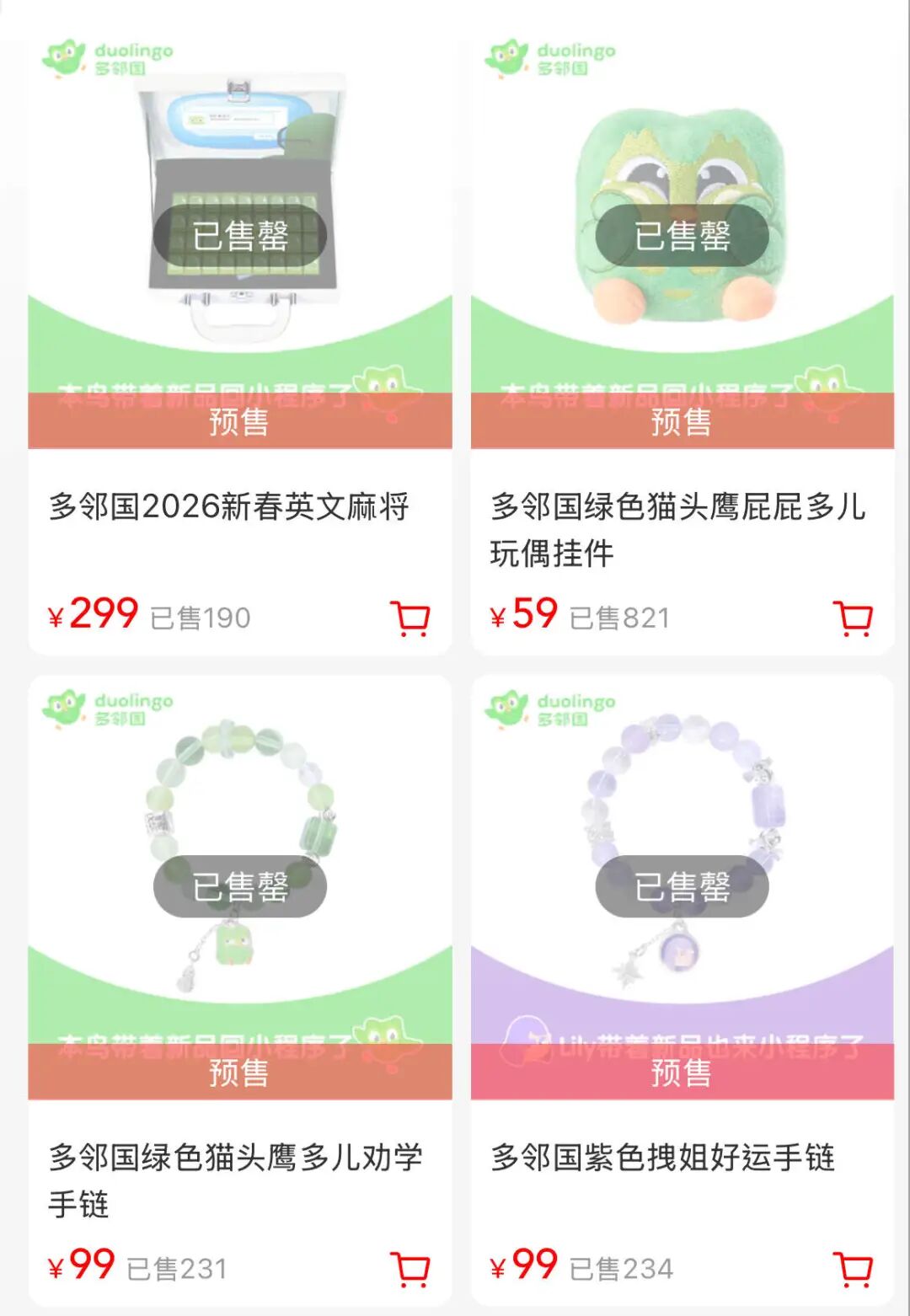 2月2日晚,四款商品在微店已经全部售罄。到2月3日下午,多邻国线上微店显示,麻将售出190套、多儿挂件售出821套、多儿劝学手链售出231套、拽姐好运手链售出234套。