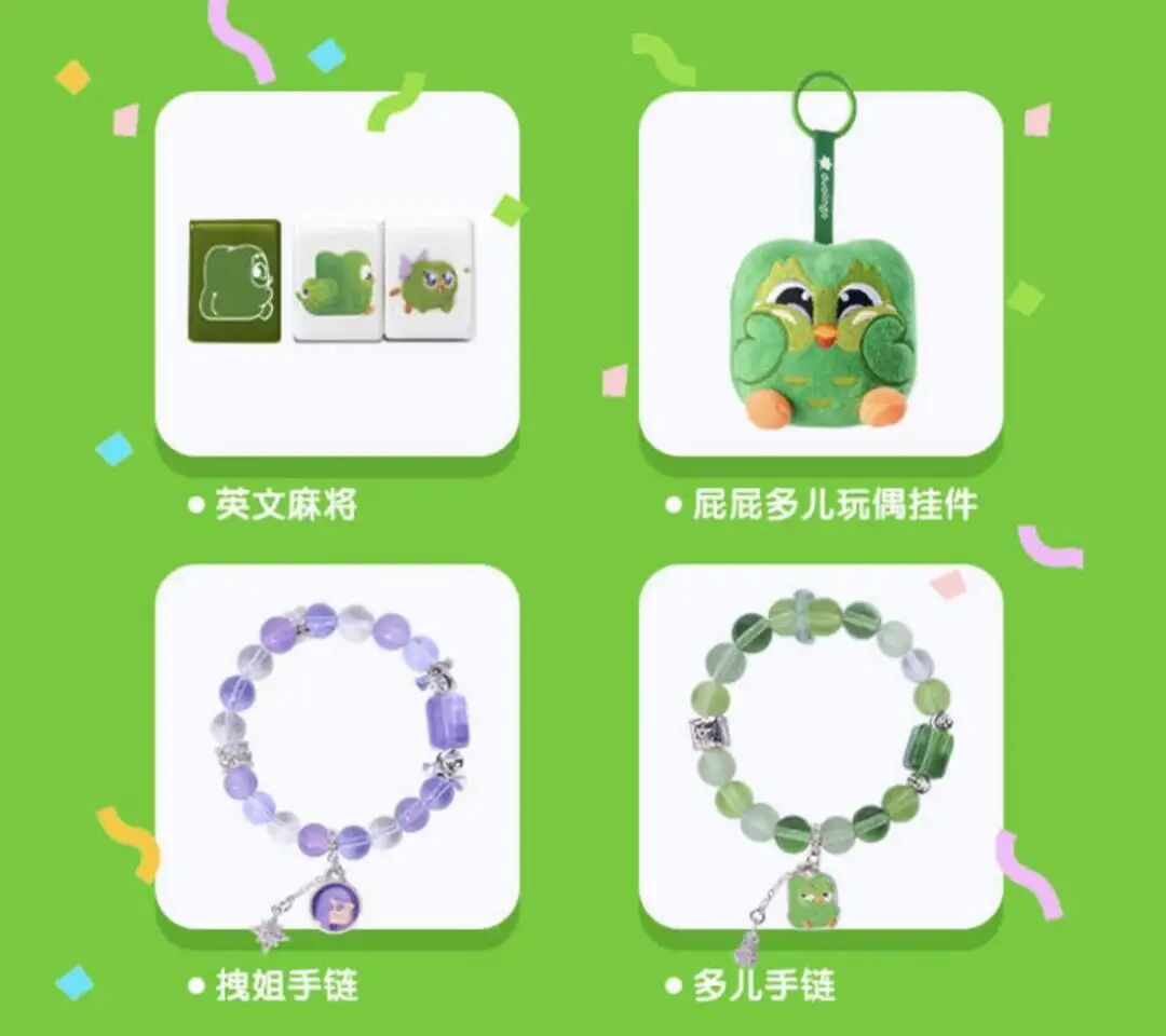 2月1日晚8点,多邻国公众号推文开售定制款麻将、挂件和手串。每个商品包含唯一编码的收藏卡——多儿也搞起了限定款。