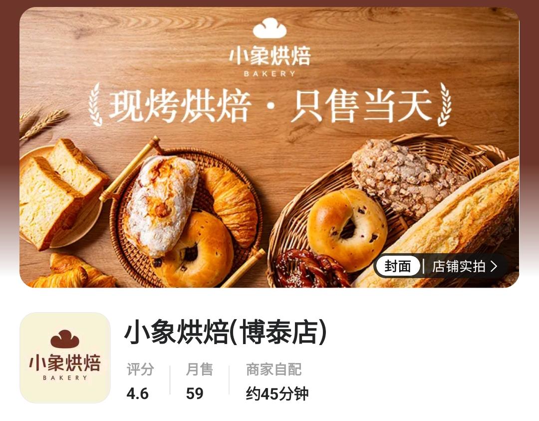 页面显示,小象烘焙不仅有独特的品牌logo,且明确强调“现烤烘焙·只售当天”。