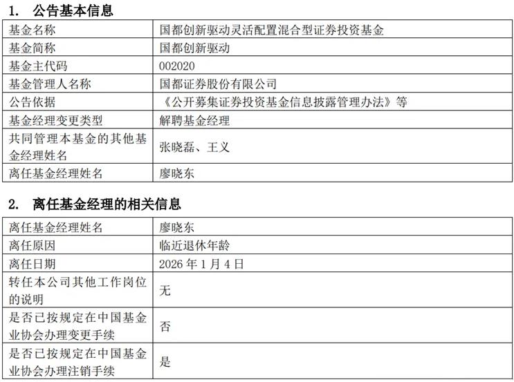 1月7日,国都基金发布公告,基金经理廖晓东因临近退休年龄,卸任其管理的国都聚成混合与国都创新驱动两只基金,并且已经在中国基金业协会办理变更手续。