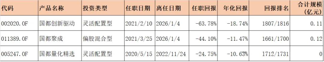 在他管理的10个季度中,国都量化精选仅3个季度实现盈利,任期内亏损幅度达24.75%,最终因业绩持续低迷,在2022年11月清盘。