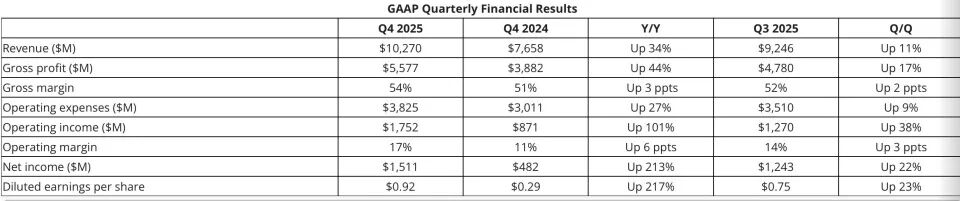 2月4日,AMD发布在截至2025年12月27日的第四财季财报——营收102.7亿美元,同比增长34%,首次突破单季100亿美元关口;同期净利润15.1亿美元,同比增长213%。