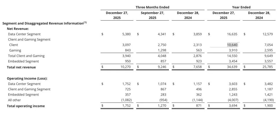 财报显示,数据中心业务贡献的营业利润达到17.52亿美元,几乎覆盖了公司整体营业利润,这意味着AMD的利润引擎正在从“多业务拼凑”转向“单一高价值核心”。