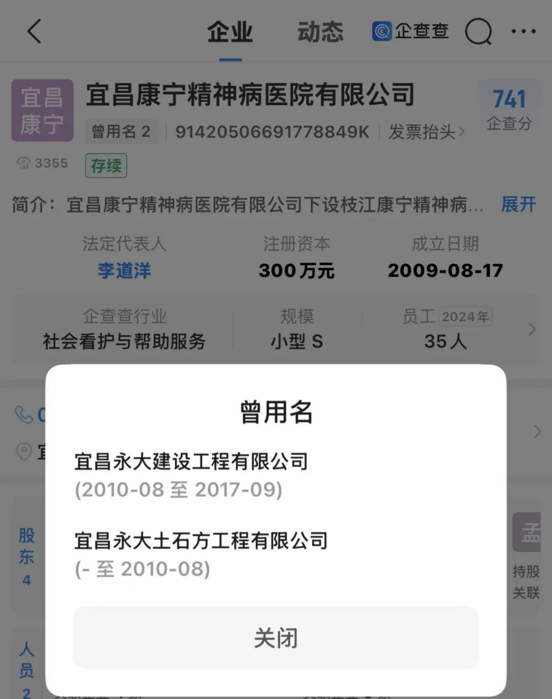 除了宜昌夷陵康宁精神病医院,李道洋名下还有三家关联企业:枝江康宁精神病医院在 2023 年8月1日注销,宜昌维康防护用品有限公司2019年注销,目前只有枝江康宁医院有限公司还在正常经营。