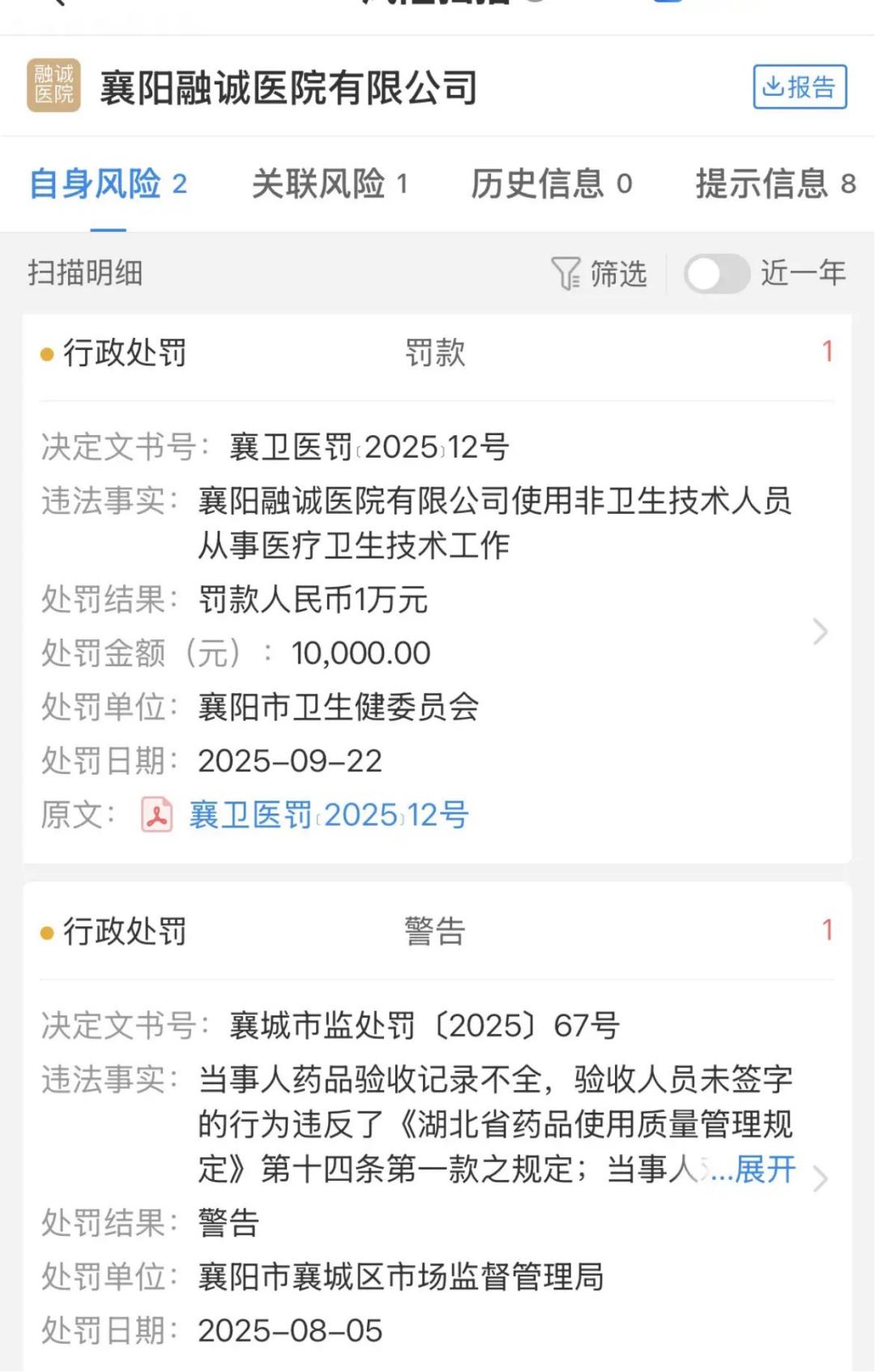 2024年9月,因使用非卫生技术人员开展医疗卫生技术工作,被襄阳市卫生健康委员会处以1万元罚款。
