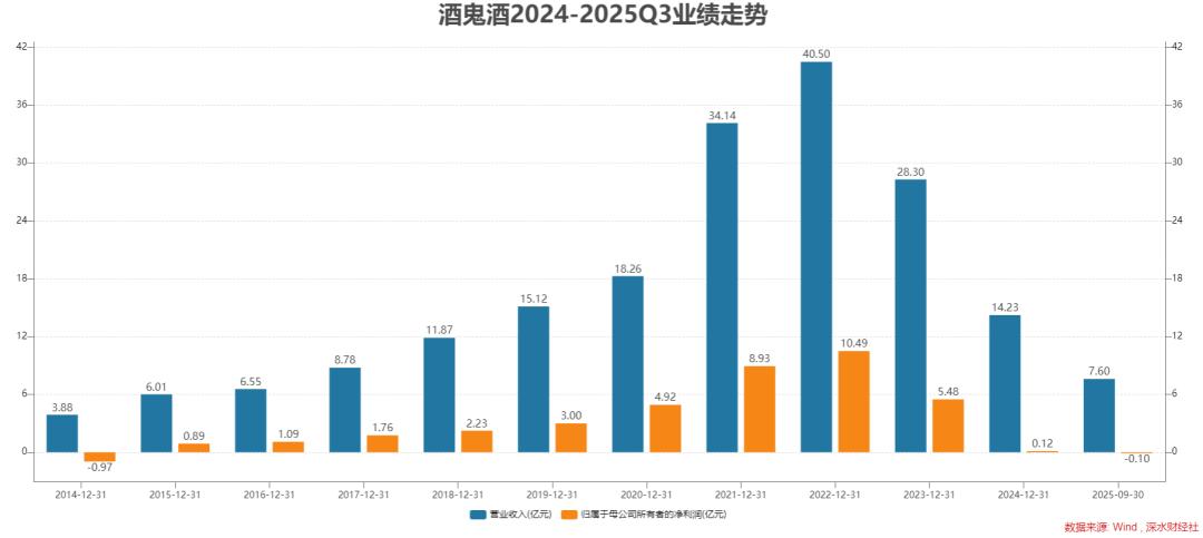 具体来看,酒鬼酒2025年三季度表现尤为惨淡,实现营业收入7.60亿元,同比下降36.21%,较行业平均降幅高出16个百分点;归母净利润亏损0.10亿元,同比下降117.36%,同样大幅偏离行业平均水平。