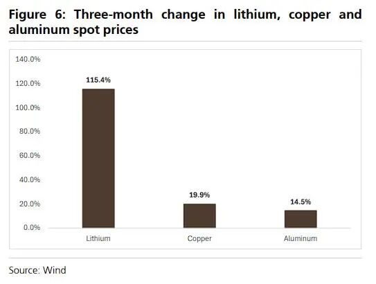来看瑞银刚出的这份研报,过去三个月,铝价涨了,单车成本多出约600块;铜价涨了,又多出1200块。但这都是小头,波动最大的是锂,一辆装80度电池的纯电车,光锂成本就涨了约3800元!