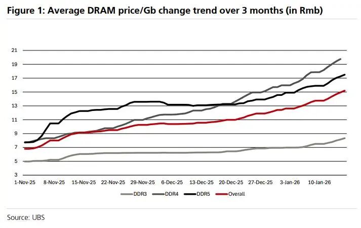 瑞银扒到的数据更具体:一辆智能车内存成本约700元,但过去三个月内存价格暴涨180%,直接干到2000元/车。
