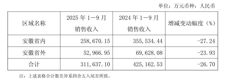 作为区域酒企,全国化是必经之路。2023年6月,口子窖在年度业绩说明会上表示,2022年以来明确“加快实现百亿口子,进入全国白酒第一方阵”的战略目标。到了2024年,口子窖公布未来三年战略规划,提出实现销量规模翻番,加速推进“百亿口子”的战略落地。现实却是,口子窖的省外收入持续萎缩。2024年,其安徽省外市场收入约9.20亿元,同比减少2.88%。2025年前三季度,安徽省外市场实现销售收入约5.3亿元,同比下降23.93%。