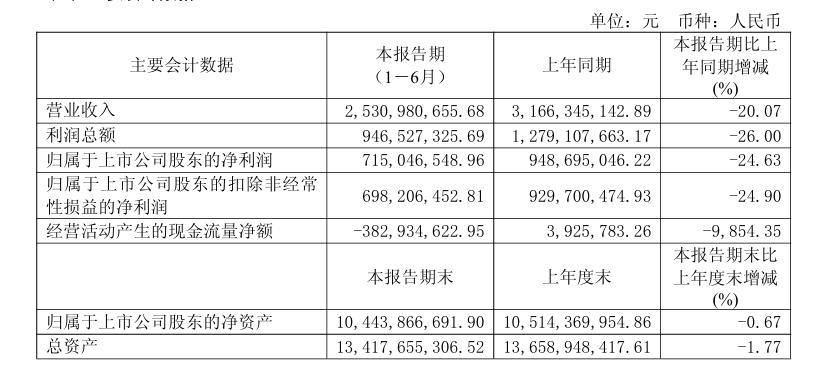 进入2025年,口子窖业绩下滑态势加剧。半年报数据显示,2025年上半年,口子窖实现营业收入约25.31亿元,同比减少20.07%;归属于上市公司股东的净利润约7.15亿元,同比下降24.63%。