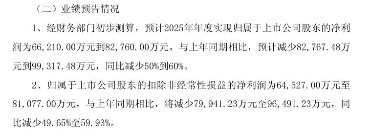 近日,口子窖发布《2025年年度业绩预减公告》。口子窖预测,2025年其归属于上市公司股东的净利润为6.62亿至8.28亿元,同比减少50%到60%;归属于上市公司股东的扣除非经常性损益的净利润为6.45亿至8.11亿元,同比减少49.65%至59.93%。