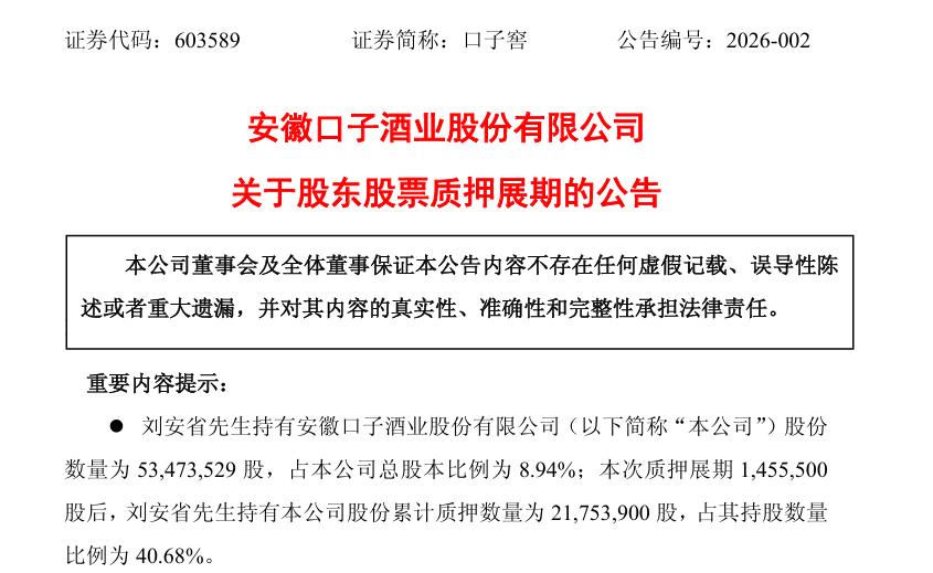 根据口子窖近期公告,刘安省于1月9日将其持有的145.55万股股份办理质押展期,到期日延至2027年1月8日,资金用途为偿还债务。截至披露日,刘安省个人持股5347.35万股,占公司总股本8.94%,其中累计质押2175.39万股,质押比例已达40.68%。