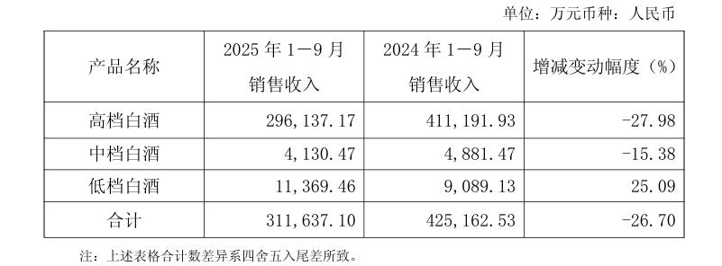 高端白酒业务一直是口子窖的核心收入来源,但这一支柱在2025年前三季度出现显著动摇。期内,其高档白酒产品收入仅为29.61亿元,同比大幅下滑27.98%。