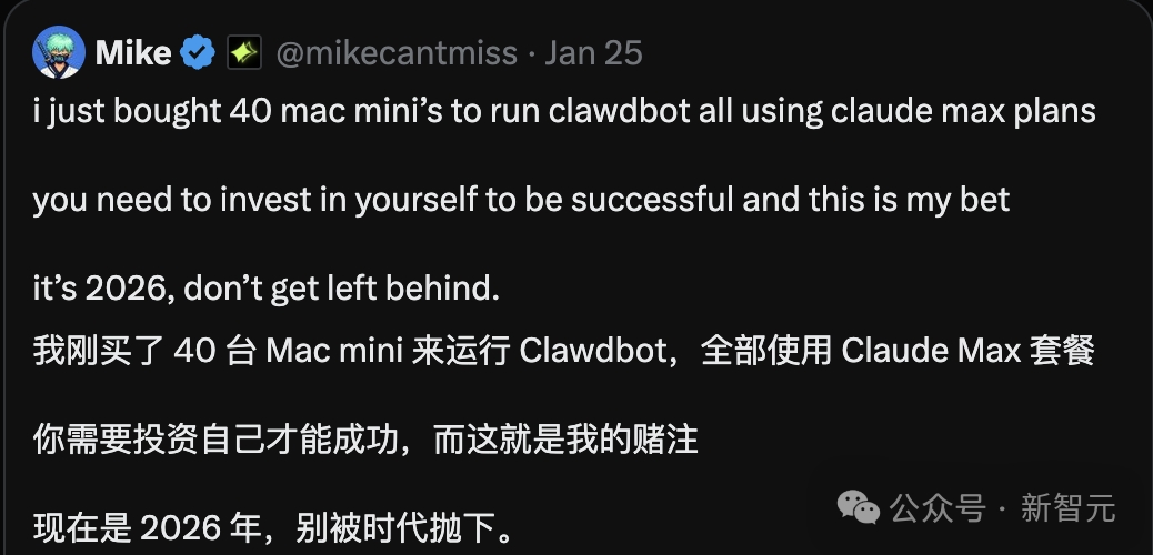 甚至还有网友晒出了自己在Clawdbot上的新赌注——40台Mac mini:
