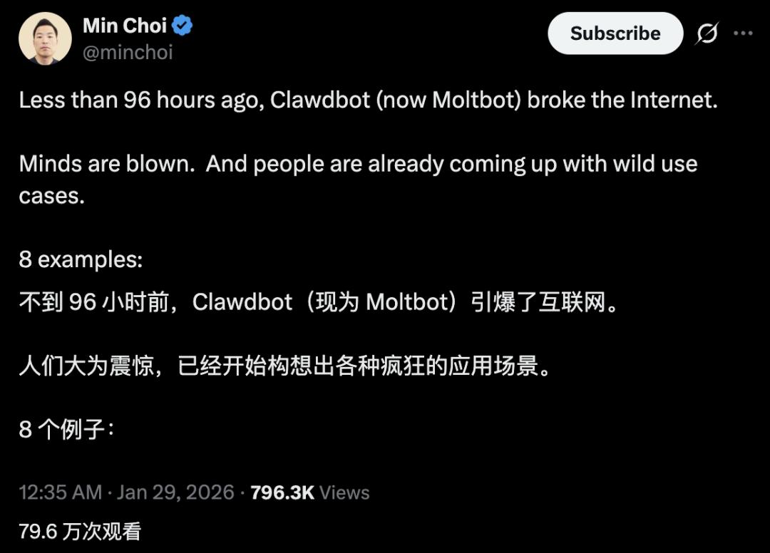 网友Min Choi在X平台上搜集了近日最火爆的8个Clawdbot用例,让我们看到了一个更能干,但同时也更危险的AI助手。