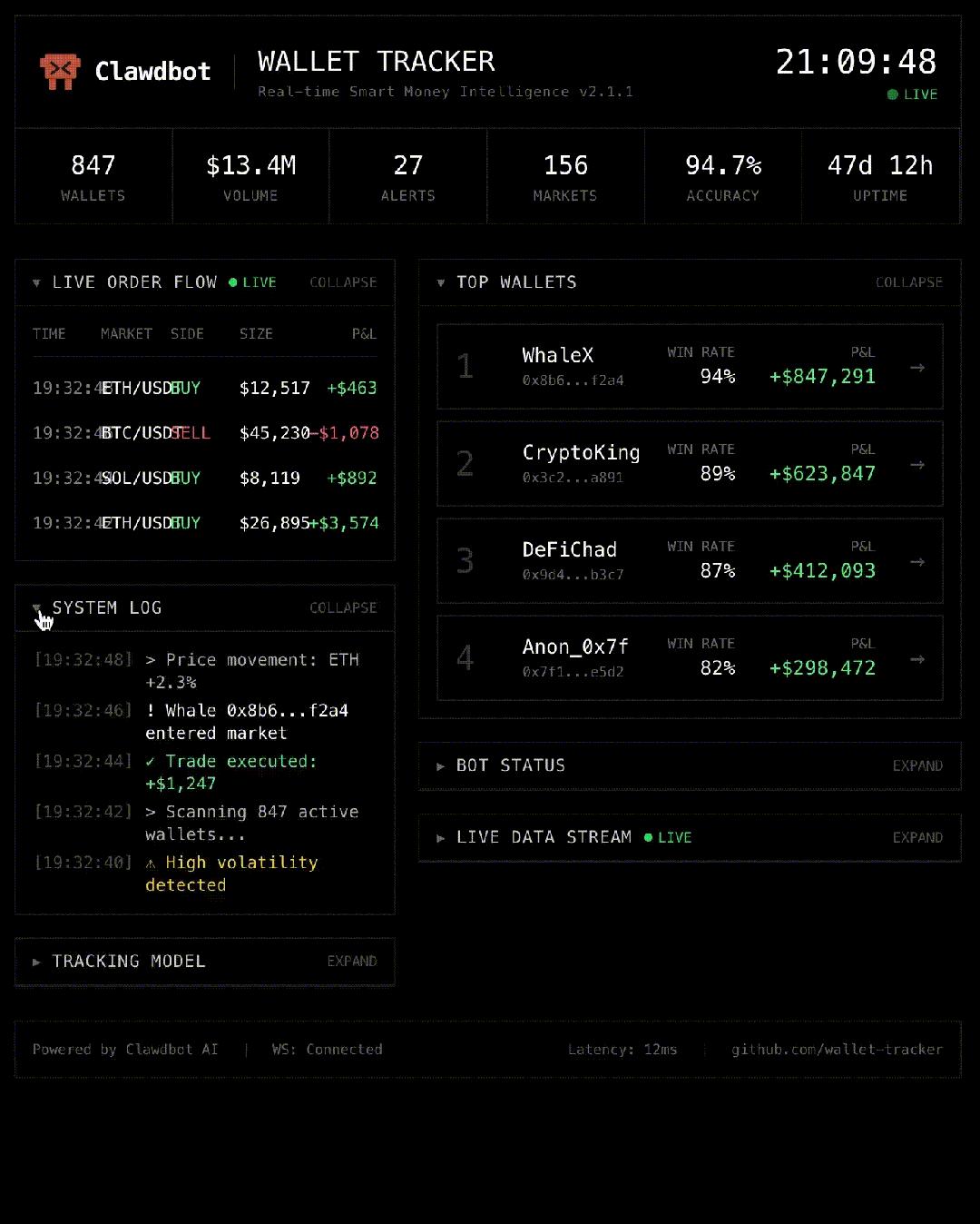 Clawdbot Wallet Tracker可以持续监控「WhaleX」和「CryptoKing」这些巨鲸账户(持有大量资产的大户),不知疲倦、不会分心地去分析胜率、计算利润,寻找那些低胜率但高回报的异常机会。