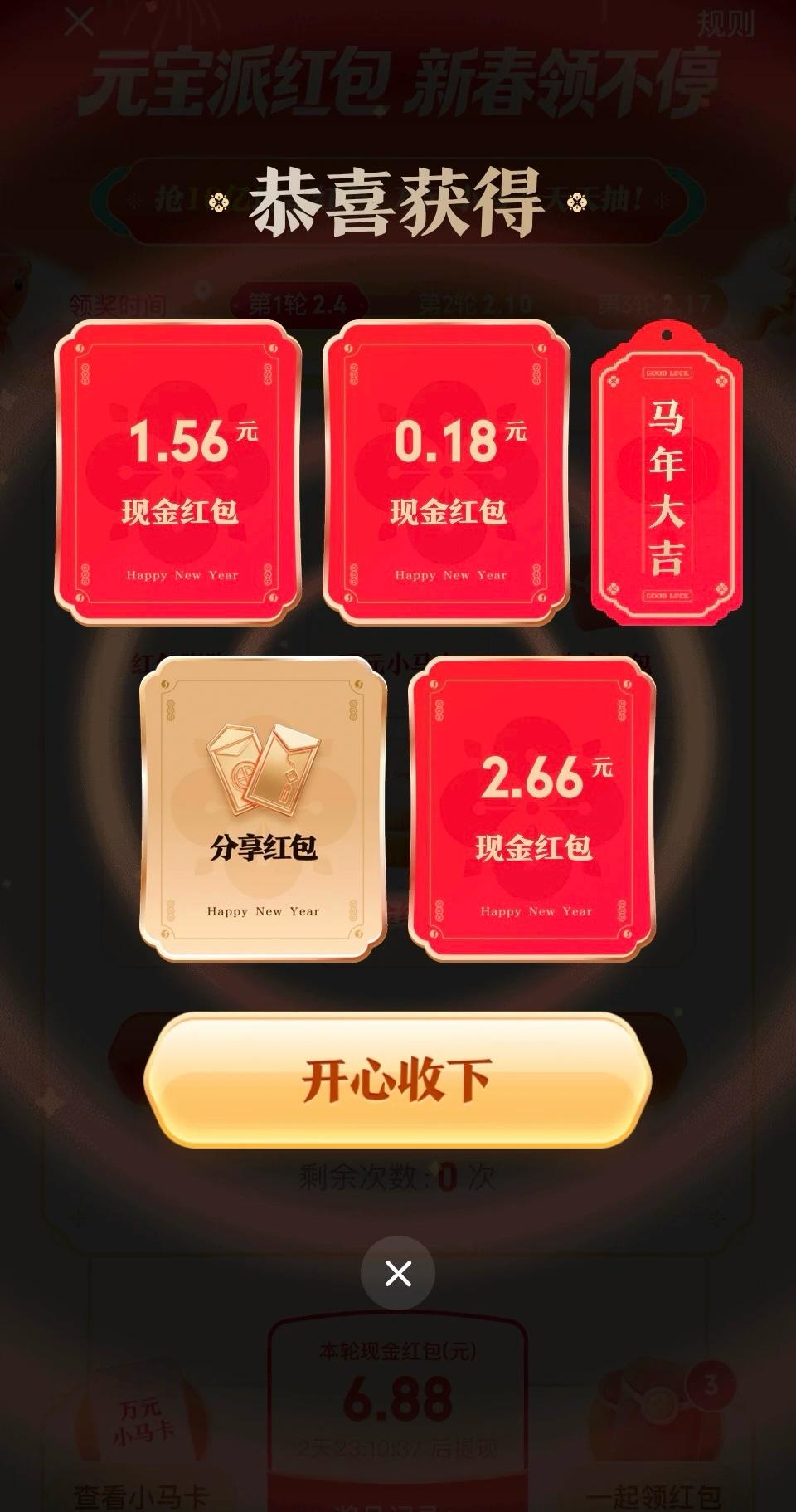 “0.18元”“0.66元”——这是不少用户在元宝红包中最常见的起手式。有时抽到红包膨胀卡,金额还能直接翻倍。即便没有抽中现金或惊喜权益,屏幕上也会依次展开设计精致的电子对联,“一马当先”“马到成功”“龙马精神”“吉祥如意”,元宝用视觉与情绪价值补足了参与感。