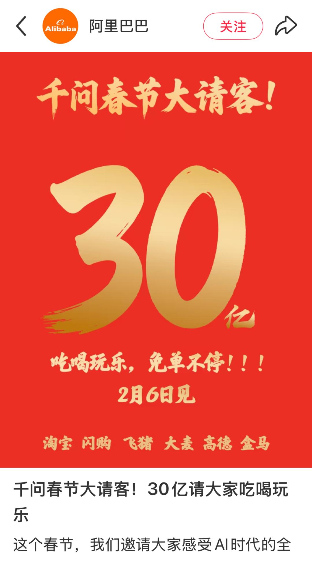 阿里旗下的千问宣布投入30亿元启动春节请客计划,将于2月6日正式上线。百度投入5亿元红包,并联动北京台春晚力推“文心助手”。