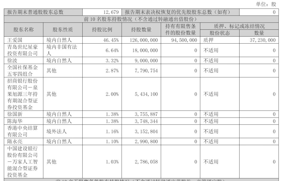 截至2025年9月30日,王爱国持股为46.45%,青岛世纪星豪投资有限公司持股为6.64%,徐波持股为3.32%;
