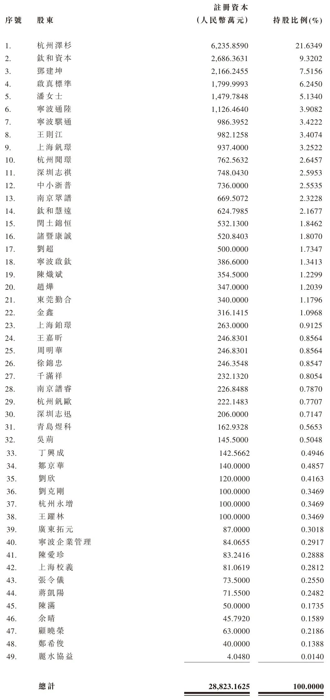 IPO前,杭州泽杉持股为21.6349%,钛和资本持股为9.3202%,邓建坤持股为7.5156%,启真标准持股为6.245%,潘女士持股为5.134%,宁波通陆持股为3.9082%,宁波骐通持股为3.4222%,王则江持股为3.4074%,上海钒璟持股为3.2522%;