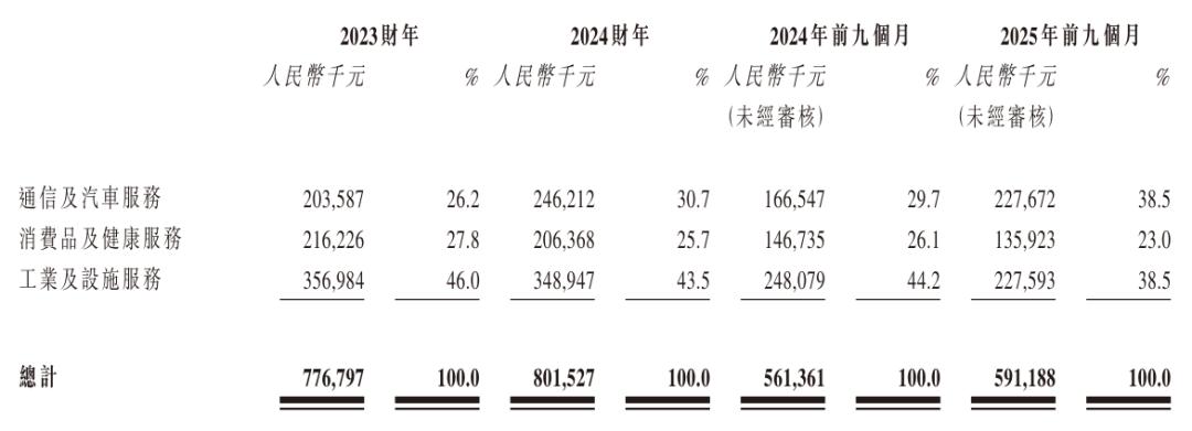 钛和检测2025年前9个月来自通信及汽车服务收入为2.28亿元,占比为38.5%;来自消费品及健康服务收入为1.36亿元,占比为23%;来自工业及设施服务收入为2.28亿元,占比为38.5%。