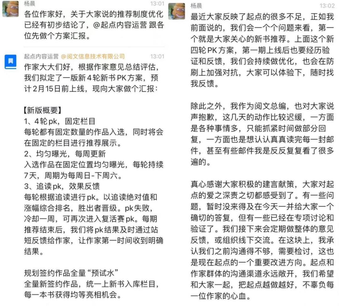在舆论压力下,阅文副总裁、总编辑杨晨出面与作者沟通态度相当诚恳,提供了邮件作为直接沟通渠道,不少作者晒出了与他的交流记录。很快,起点给出了最终解决方案,恢复了原先的推荐机制,并对此前的争议做出了道歉。
