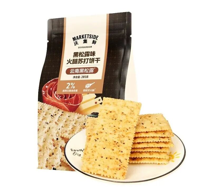 在永辉、沃尔玛(沃集鲜)自营货架上,以“云南黑松露”为核心原料的“黑松露火腿苏打饼干”稳居C位。小红书上单品3万+的笔记数,撑起了这款风味饼干的市场地位。