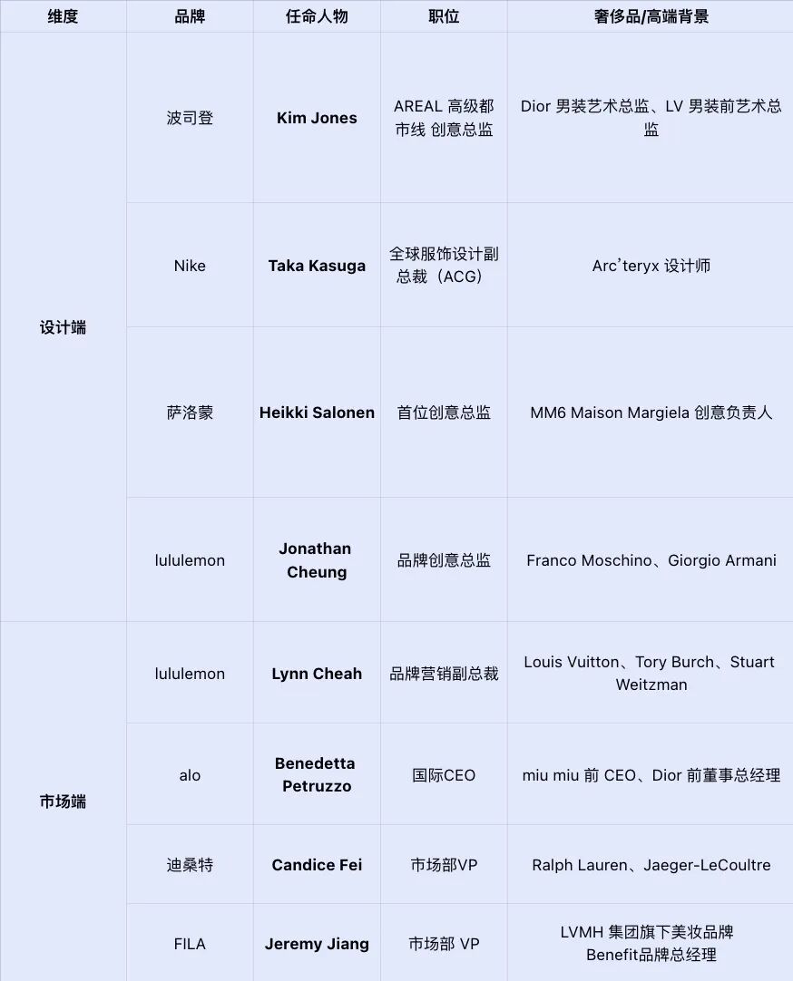 今年 1 月,alo任命Alo 任命 Dior 前高管执掌国际业务;lululemon则在两年内连续更换品牌创意和营销总监,新人选均有LV、Armani 等奢侈品从业经验;而国内市场的迪桑特、FILA,也早在2023年就已陆续吸纳具有奢侈品背景的人才,担任品牌市场部VP。