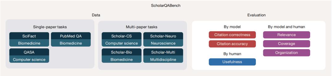 图 | ScholarQABench 的概览。该测试包含 2200 道由专家撰写的跨学科科学问题,研究团队针对其开发了自动评估与人工评估方案。