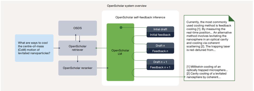 图 | OpenScholar 整体架构。OpenScholar 包含专用数据存储、检索器和语言模型,通过检索过程中的自反馈推理迭代优化响应。
