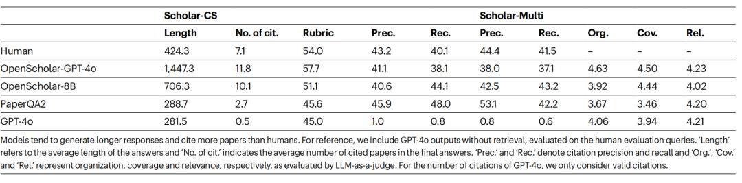 在这一严谨的新基准测试中,OpenScholar 取得了以下关键结果: