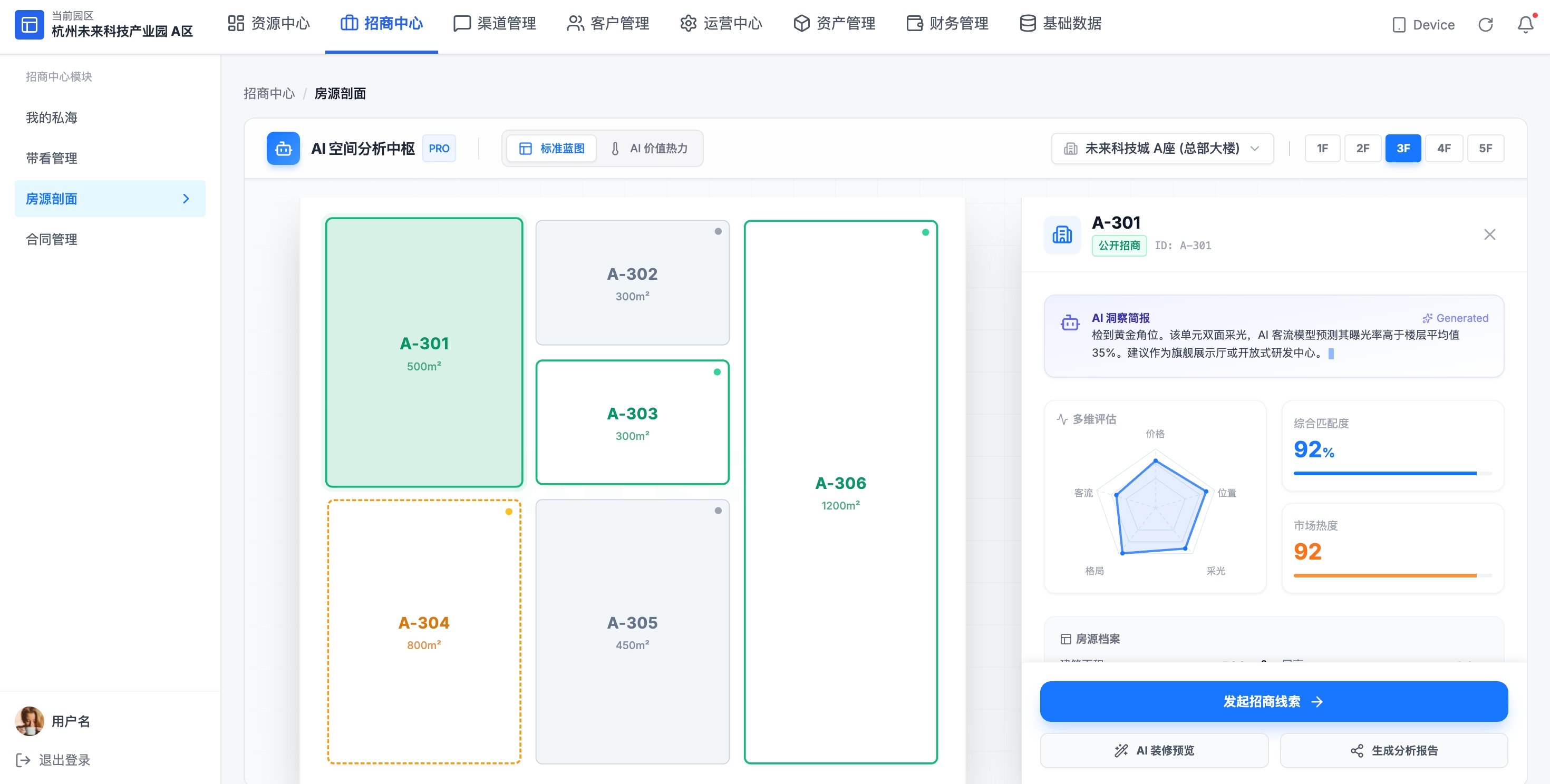 新增的AI房源分析中枢,可通过算法分析房源特征(面积、租金、配套、区位)与企业画像(行业、规模、预算、用工需求)的匹配度,为招商人员提供精准客群推荐,将出租效率提升20%以上,解决了中小园区招商难、获客成本高、转化慢的核心痛点。
