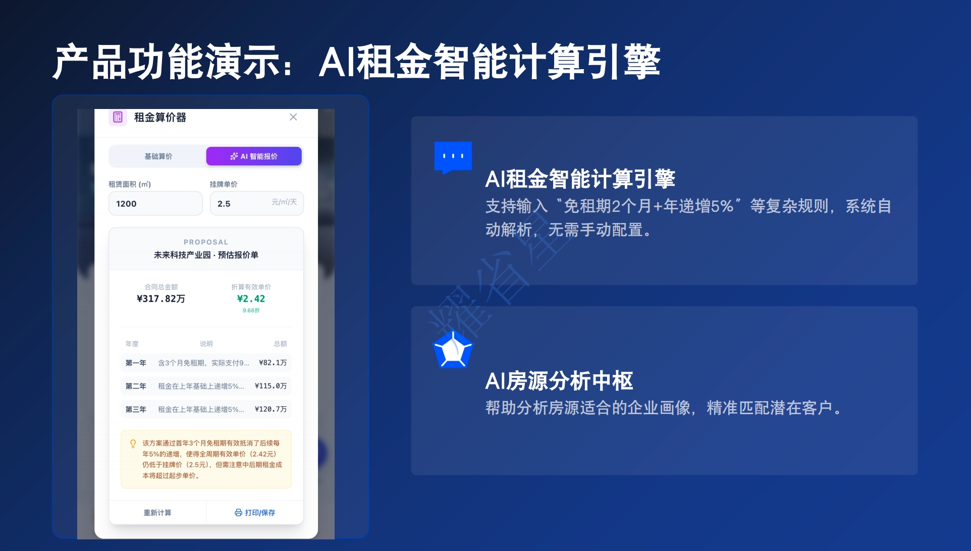 • 标准版:12,800元/年,全面覆盖AI核心功能(租金核算、运营预警、数据查询);