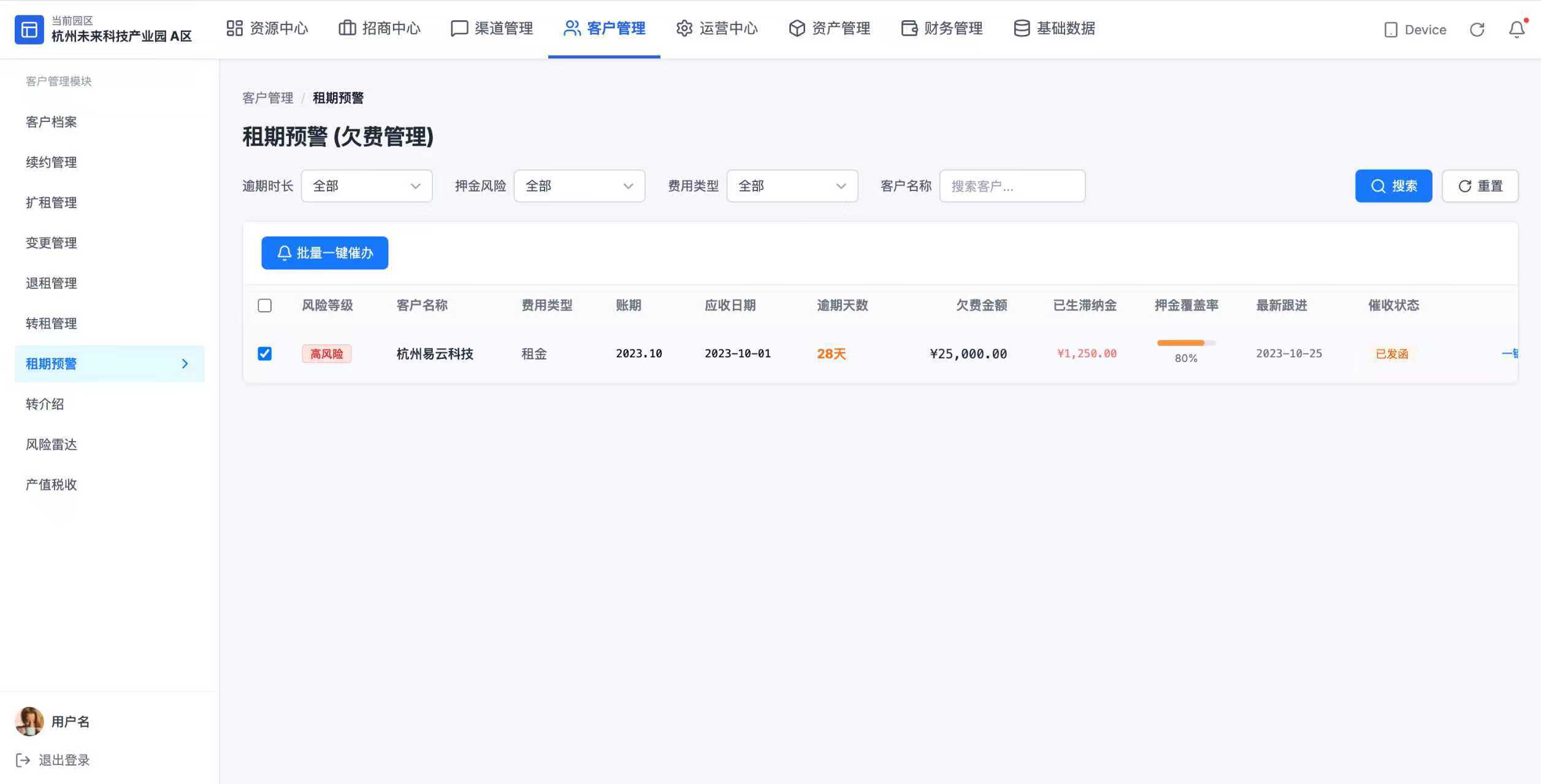 内置的AI运营Agent作为智能助手,可7×24小时监控合同到期、租金欠费、房源空置等风险,并自动生成标准化催收话术,降低人工沟通成本30%以上,解决中小园区人手不足、运营繁杂的痛点。