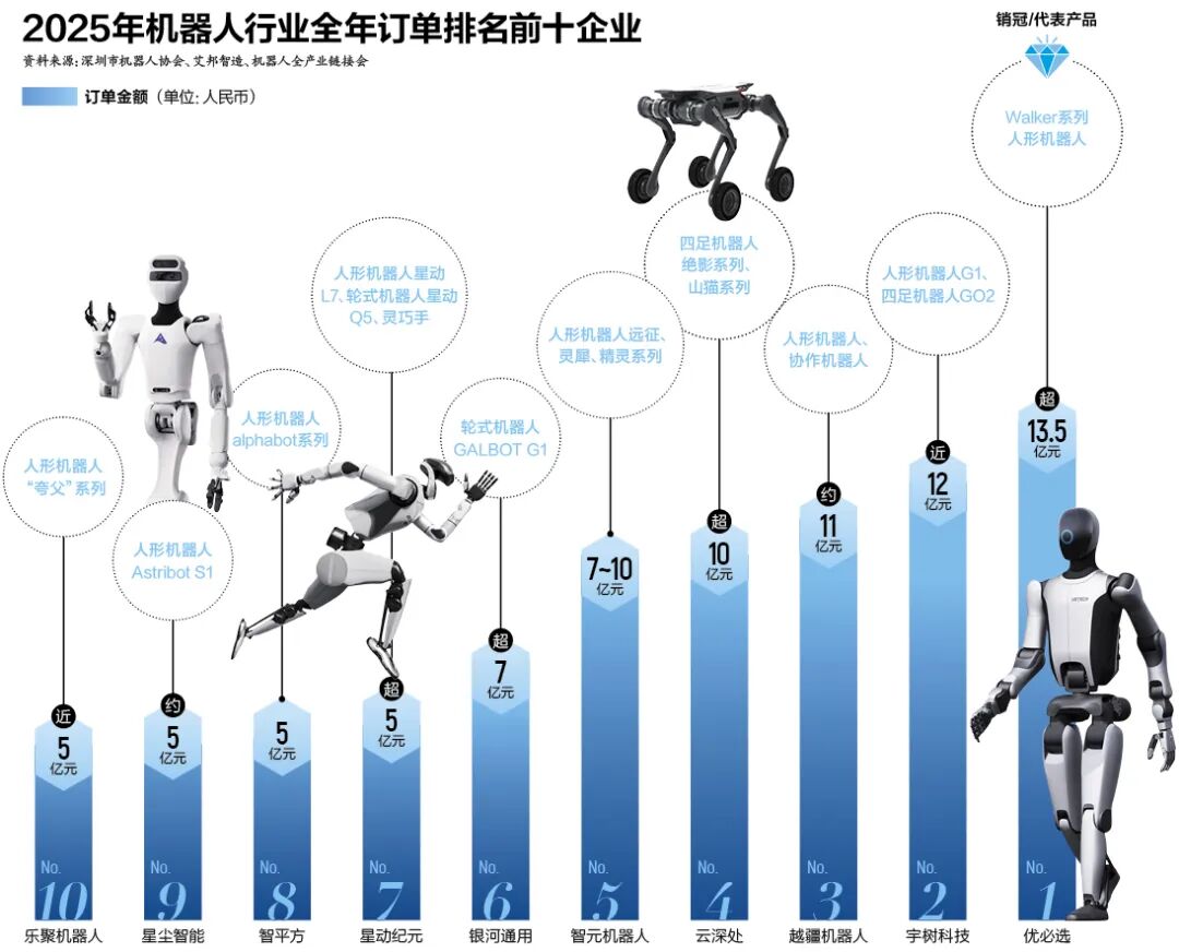 这些出货量背后是实实在在的商业合同。2025年,一批头部公司收入迅速增长:优必选全年订单总金额接近14亿元,订单多用于建设人形机器人数据采集与训练中心、人工智能教育示范项目;宇树科技全年订单金额接近12亿元,主要来自其人形机器人和协作机器人的采购;智元机器人订单金额约为7亿至10亿元,其中最大单笔订单来自中国移动,金额为7800万元,内容涉及人形双足机器人代工服务;银河通用2025年订单金额超过7亿元……