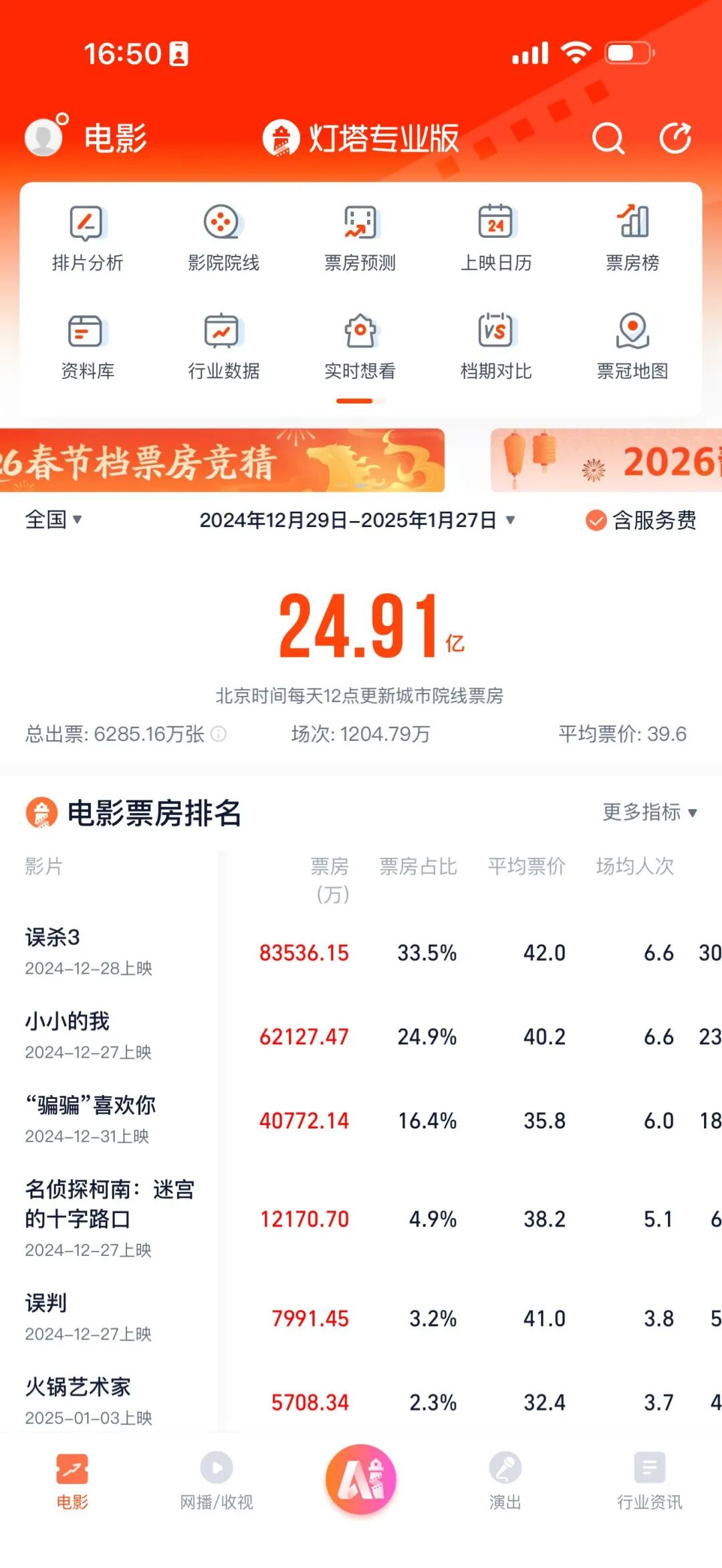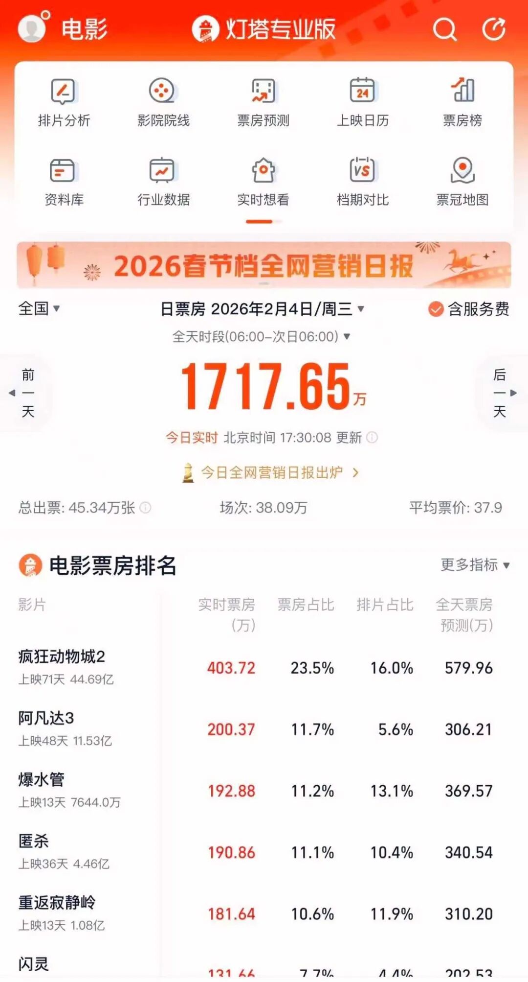 此外,记者还观察到,“春节档”前缺少大体量新片。今年市场依靠上映多日的影片来“撑场”。截至2026年2月4日17:30,当日票房前六名的影片分别为:《疯狂动物城2》《阿凡达3》《爆水管》《匿杀》《重返寂静岭》《闪灵》。其中,《疯狂动物城2》《阿凡达3》《匿杀》的上映时间分别为71天、48天和36天。