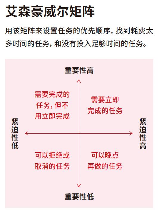 在你重新定义何为“紧急”后,你就该仔细审视一下自己的任务清单了。我们可以使用艾森豪威尔矩阵(The Eisenhower Matrix),这也被称为“紧急与重要矩阵”,它可以帮助你确定哪些任务可能花费了过多(或过少)的时间。首先,将任务清单(用关键字、要点表示)放在矩阵上(见图“艾森豪威尔矩阵”)。