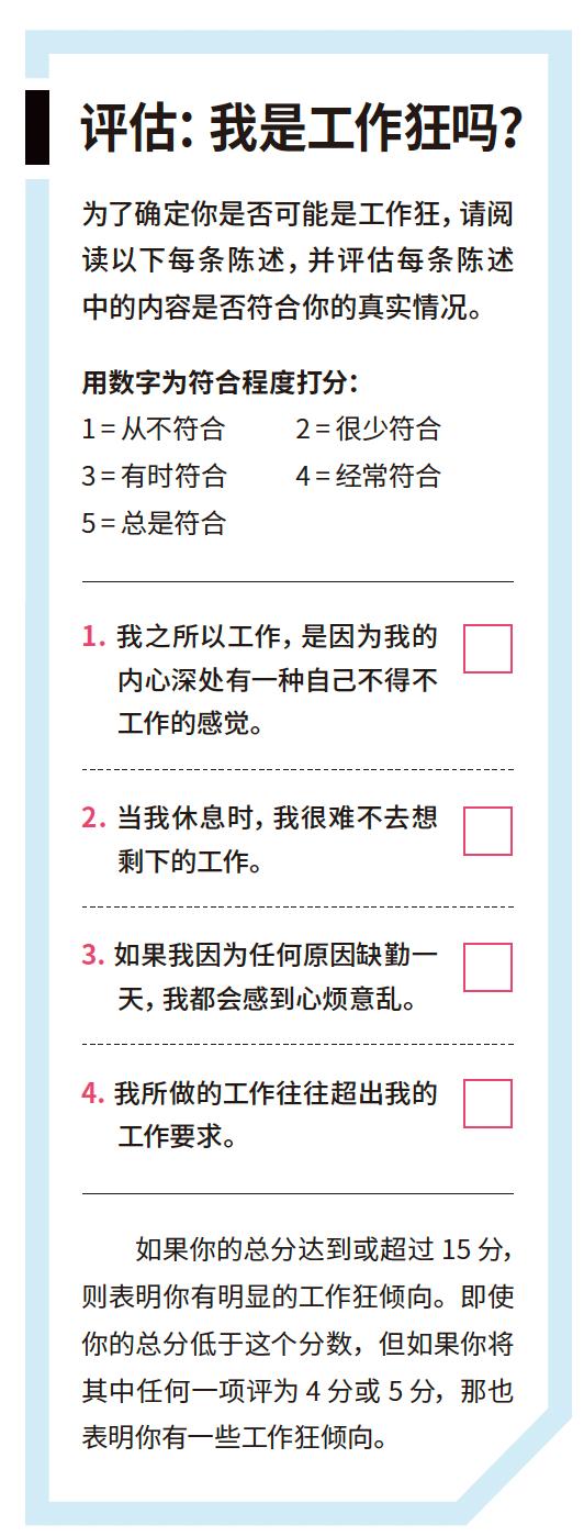 工作狂倾向的核心其实是积极的,这种倾向源于他们对工作的热情。问题在于,工作狂们无法抑制这种热情,或者有效控制这种热情。这让热情变成了一种对工作的不顾一切的痴迷,从而使得工作狂们积极地寻找各种方法来激发热情。