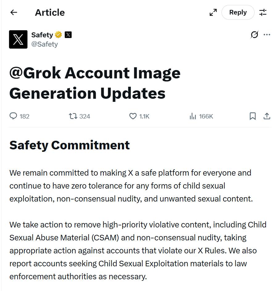 逼得 X 不得不站出来,宣布采取措施制止 Grok 生成色情图像。