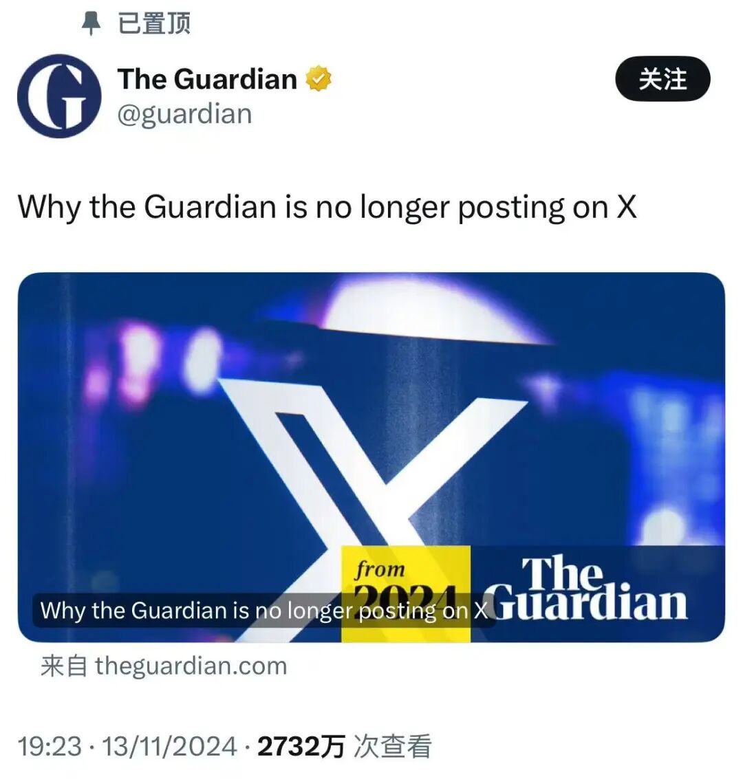 早在 2024 年,英国著名的媒体《卫报》就宣布,不会在 X 上发帖了。