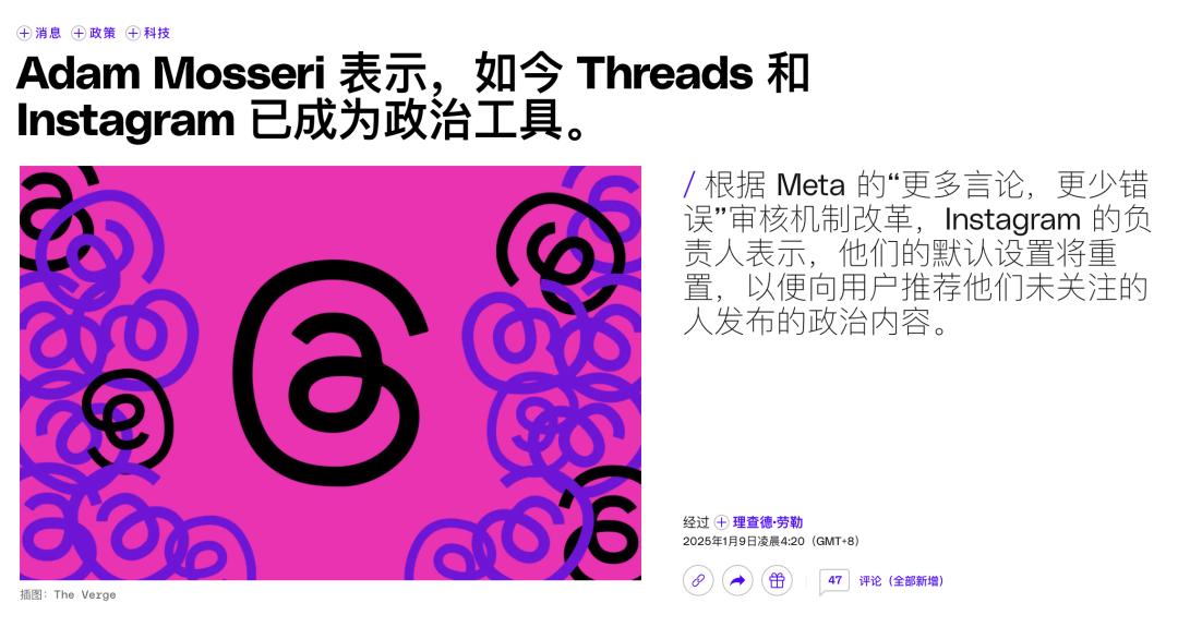 根据外媒报道,Instagram 的一把手 Adam Mosseri 在 Threads 上线之初就摊牌过,他们的目标是打造一个“更少愤怒的对话场所”,不鼓励政治或者硬新闻内容。