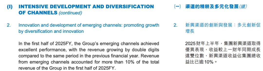 这项业务确实涨得快,2024 财年双位数增长,2025 年上半年继续强势,带动新兴渠道整体双位数增长。