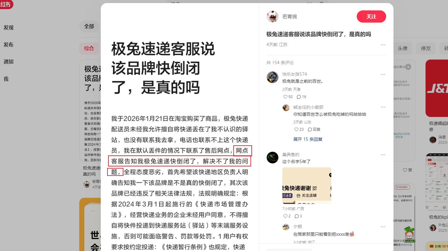 如今,在小红书等社交媒体上,与极兔关联较多的最新内容,是消费者对极兔服务的吐槽。