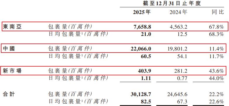 2025年财报数据清晰地揭示了这一趋势,其包裹量在东南亚同比增长67.8%,在新市场同比增长43.6%,而在中国市场同比微增11.4%。