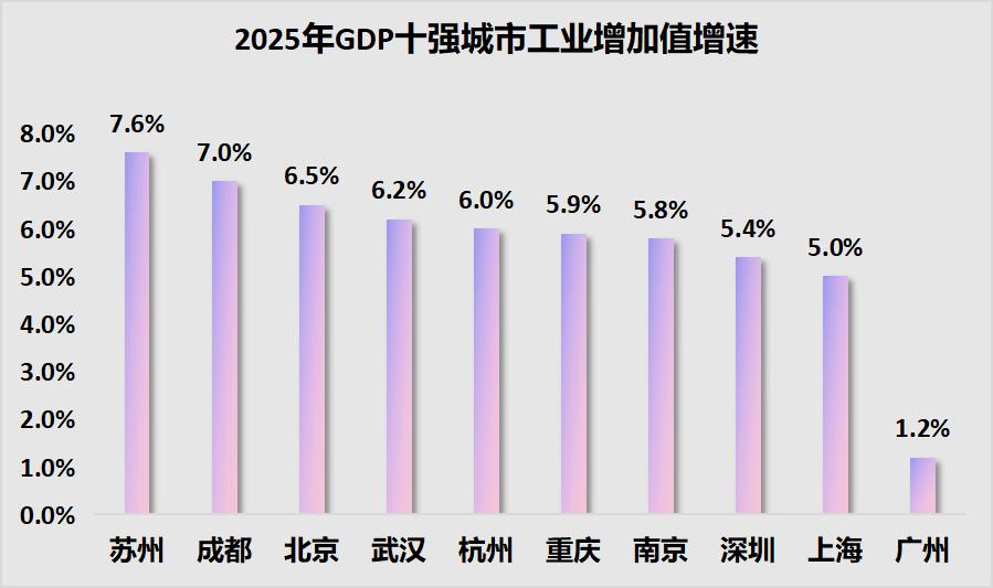 成都2025年规模以上工业增加值比上年增长7.0%,这一增速在十强城市中位居第二,仅次于苏州。