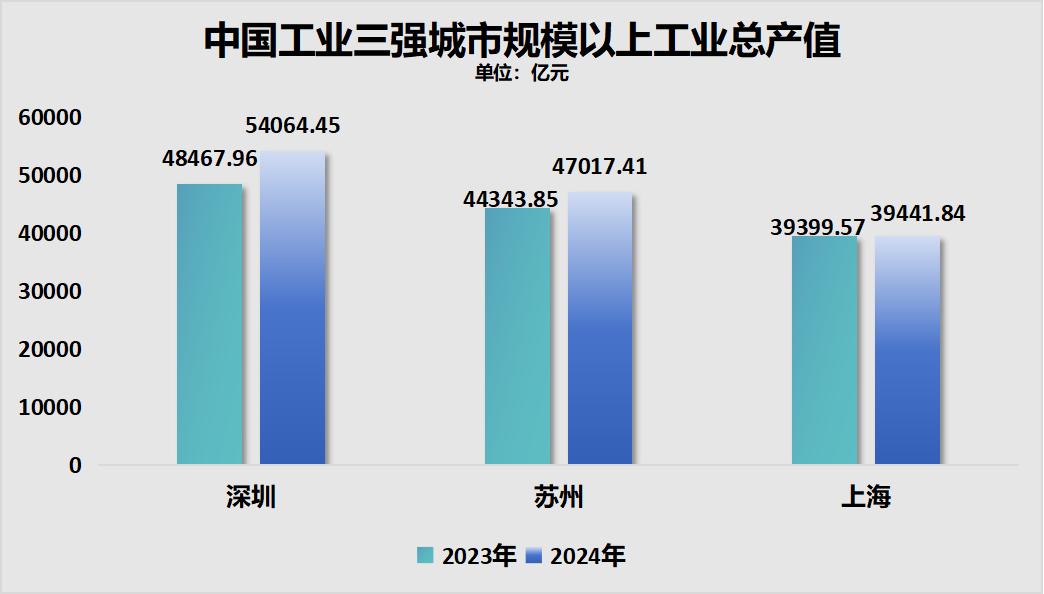 作为中国工业第一城,2024年深圳的规模以上工业总产值冲破了5万亿,高达5.4万亿,与工业第二城苏州、第三城上海之间,形成了断崖式的领先地位。