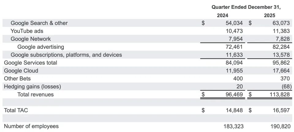 谷歌搜索及其他业务依然稳固,当季收入630.7亿美元,同比增长17%,继续构成Alphabet最核心的现金流来源,也在一定程度上对冲了部分广告相关业务的波动。